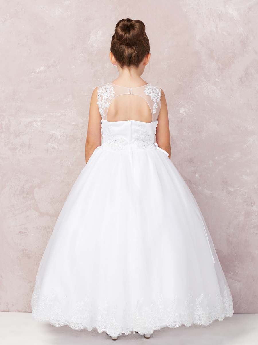 5757 White Communion Dresses Illusion Neckline With Lace Bodice With Floral Applique