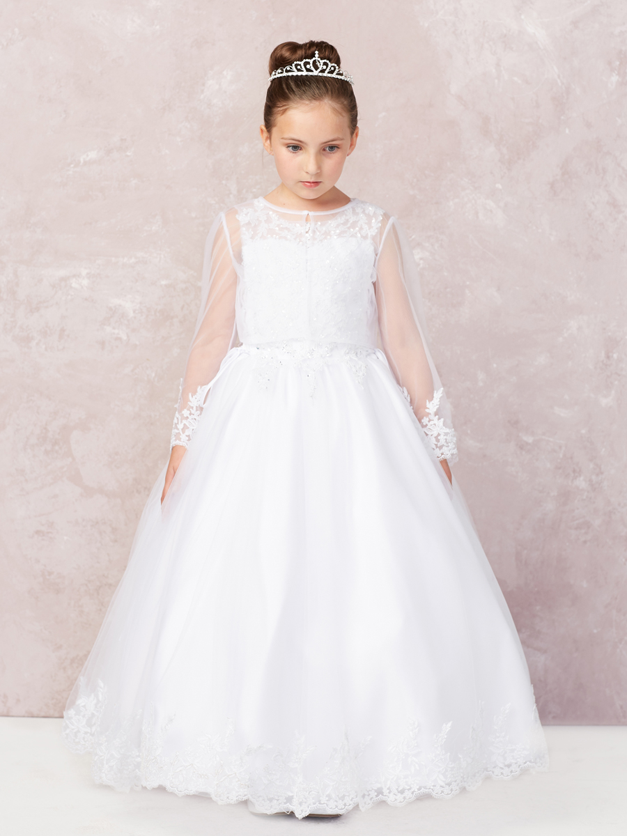1205 White Communion Dresses Illusion Neckline With Lace Applique Bodice