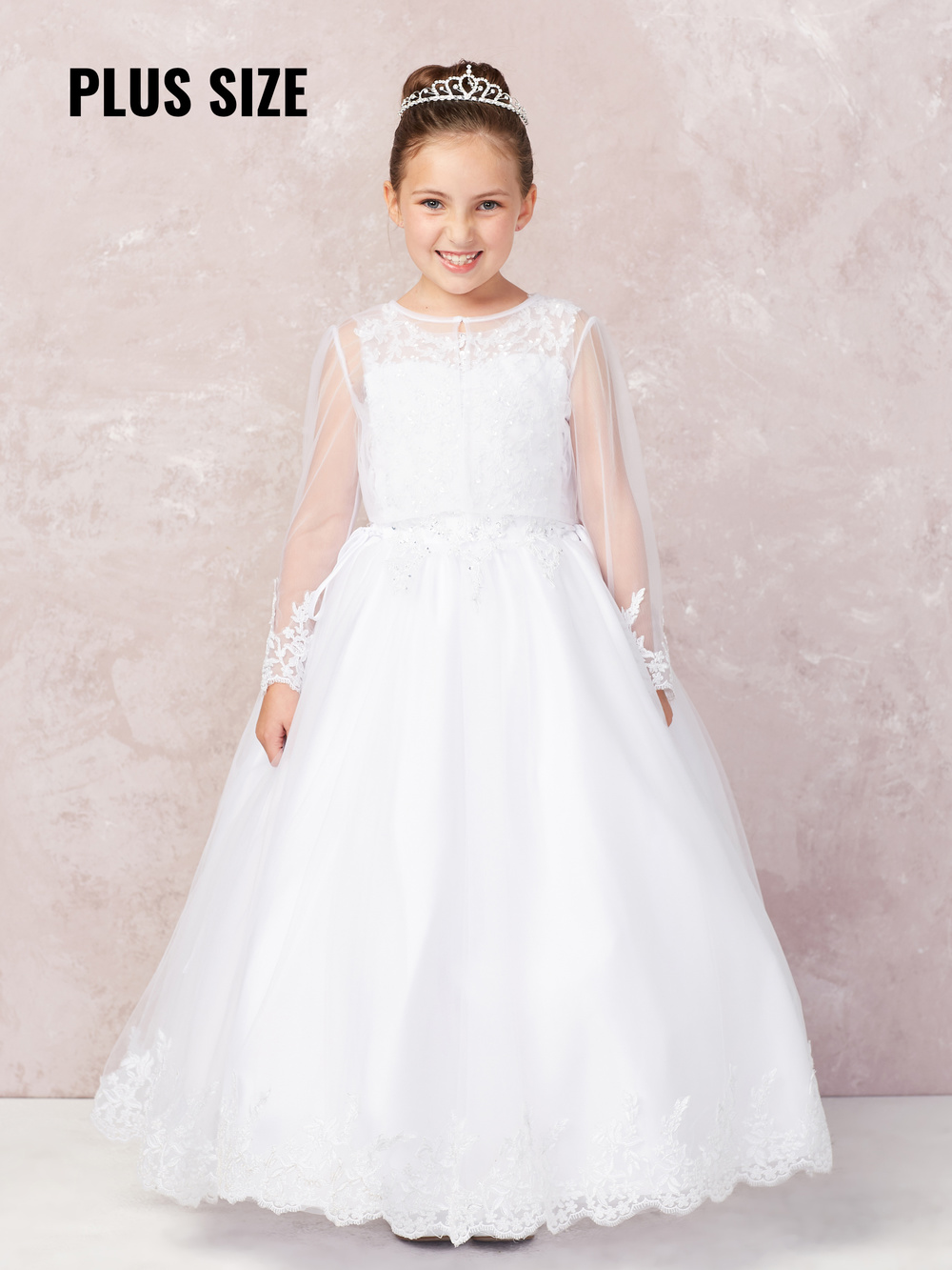 1182X WHITE Communion Dresses Lace Bodice with Lace Hem, Comes with a Mesh Jacket (Plus Size)